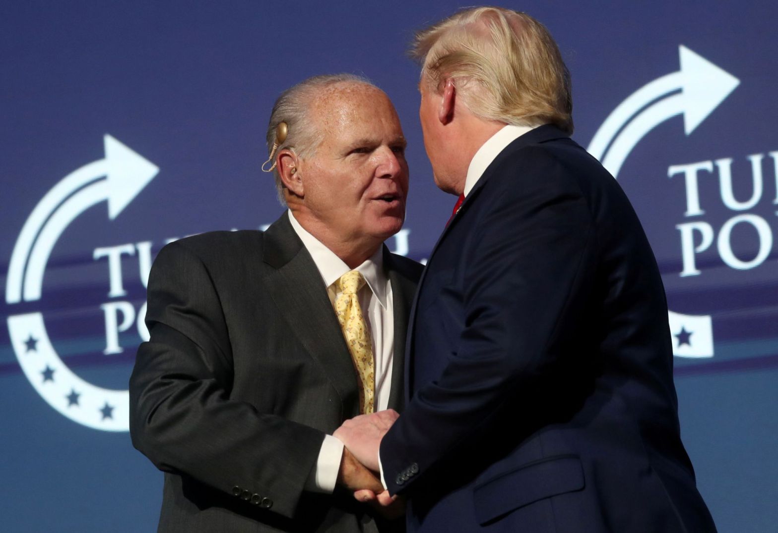 Former U.S. President Donald Trump greets Rush Limbaugh before delivering remarks at the Turning Point USA Student Action Summit at the Palm Beach County Convention Center in West Palm Beach, Florida, U.S. December 21, 2019. REUTERS/Leah Millis/File Photo